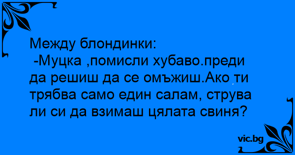 -Муцка ,помисли хубаво.преди да решиш да се омъжиш.Ако ти трябва само един салам, струва ли си да взимаш цялата свиня?