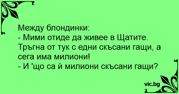 Между блондинки:<br />- Мими отиде да живее в Щатите. Тръгна от тук с едни скъсани гащи, а сега има милиони!<br />- И 'що са ѝ милиони скъсани гащи?