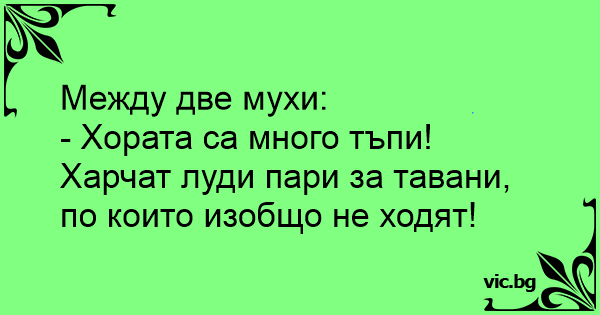 Между две мухи:<br />- Хората са много тъпи! Харчат луди пари за тавани, по които изобщо не ходят!