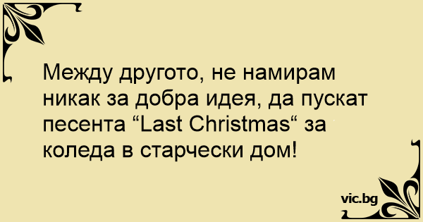 Между другото, не намирам никак за добра идея, да пускат песента “Last Christmas“ за коледа в старчески дом!