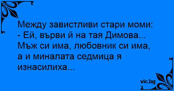 Две комшики расправаат за третата: - Добро бе, ваа Трпана може ли толку среќа да има... - 3ошто? - Ами, си има маж, си има љубавник, а пред два дена и ја силувале!