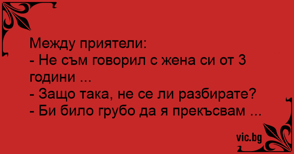 "Sai che ormai sono due anni che non parlo con mia moglie?!" Confida un uomo ad un amico. "Come? Non sapevo aveste litigato!" gli risponde l'altro. "No, no...non abbiamo litigato, è che non voglio interromperla!"