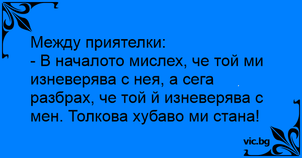 - В началото мислех, че той ми изневерява с нея, а сега разбрах, че той й изневерява с мен. Толкова хубаво ми стана!
