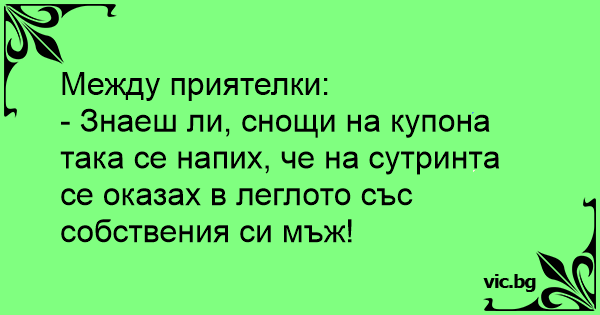- Знаеш ли, снощи на купона така се напих, че на сутринта се оказах в леглото със собствения си мъж!