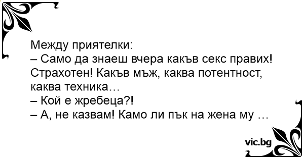– Само да знаеш вчера какъв cekc правих! Страхотен! Какъв мъж, каква потентност, каква техника…