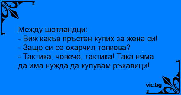 Между шотландци: - Виж какъв пръстен купих за жена си! - Защо си се охарчил толкова? - Тактика, човече, тактика! Така няма да има нужда да купувам ръкавици!