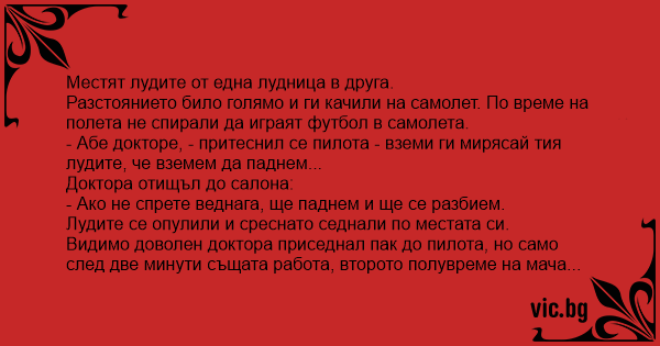 - Абе докторе, - притеснил се пилота - вземи ги мирясай тия лудите, че вземем да паднем...