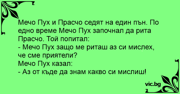 Мечо Пух и Прасчо седят на един пън. По едно време Мечо Пух започнал да рита Прасчо. Той попитал: