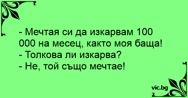 - Мечтая си и аз, като баща ми, да стана милионер.. - Баща ти милионер ли е? - Не, и той така си мечтае...