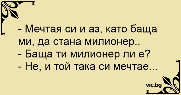 — Я мрію заробляти по десять тисяч доларів на місяць, як мій батько — Твій батько заробляє десять тисяч доларів на місяць? — Ні, він теж про це мріє.