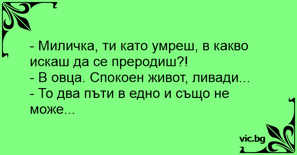 - Миличка, ти като умреш, в какво искаш да се преродиш?!