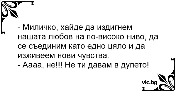 - Миличко, хайде да издигнем нашата любов на по-високо ниво, да се съединим като едно цяло и да изживеем нови чувства.