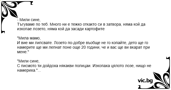 И вие ми липсвате. Лозето по-добре въобще не го копайте, дето ще го намерите ще ми лепнат поне още 20 години, че и вас ще ви вкарат при мене."