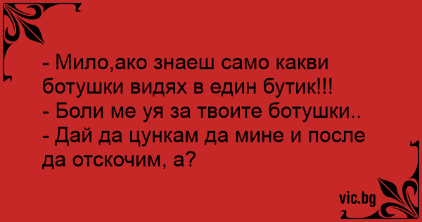 Леле злато знаеш ли какви чизме сам видела? - Ма боли ме мене к*р за твои чизме! - А злато да га цуну ја да ти пројде, па да идемо да ги купимо чизме?
