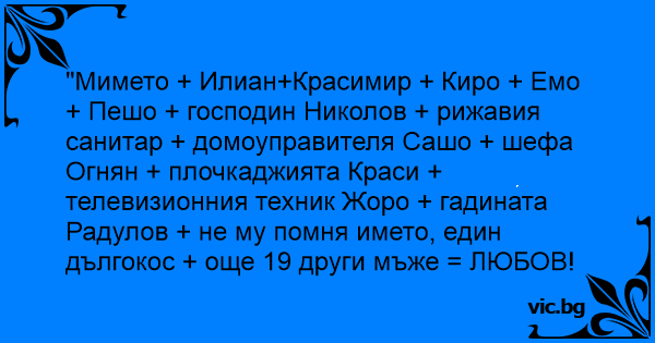 "Мимето + Илиан+Красимир + Киро + Емо + Пешо + господин Николов + рижавия санитар + домоуправителя Сашо + шефа Огнян + плочкаджията Краси + телевизионния техник Жоро + гадината Радулов + не му помня името, един дългокос + още 19 други мъже = ЛЮБОВ!