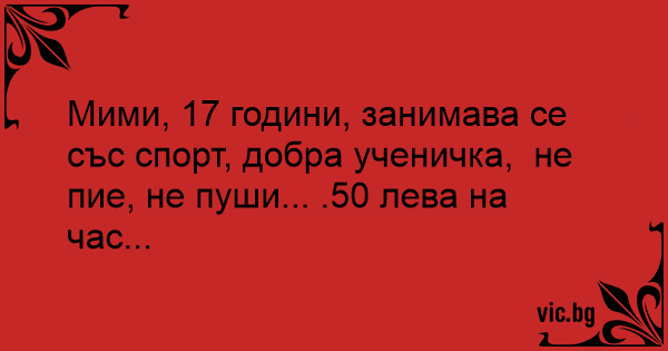 Мими, 17 години, занимава се със спорт, добра ученичка, не пие, не пуши... .50 лева на час...