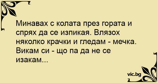 Минавах с колата през гората и спрях да се изпикая. Влязох няколко крачки и гледам - мечка.
