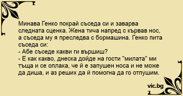 - Е как какво, днеска дойде на гости "милата" ми тъща и се оплака, че й е запушен носа и не може да диша, и аз реших да й помогна да го отпушим.