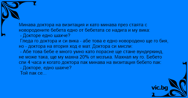 Гледа го доктора и си вика - абе това е едно новородено ще го бия, но - доктора на втория ход е мат. Доктора си мисли: