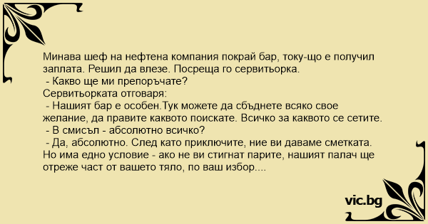 Минава шеф на нефтена компания покрай бар, току-що е получил заплата. Решил да влезе. Посреща го сервитьорка.