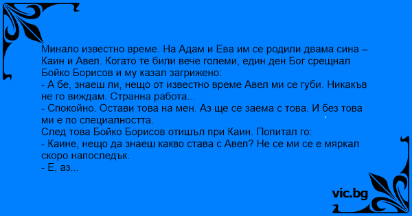 Минало известно време. На Адам и Ева им се родили двама сина – Каин и Авел. Когато те били вече големи, един ден Бог срещнал Бойко Борисов и му казал загрижено: