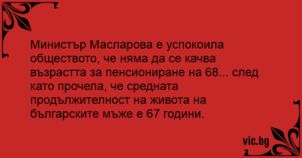 Министър Масларова е успокоила обществото, че няма да се качва възрастта за пенсиониране на 68... след като прочела, че средната продължителност на живота на българските мъже е 67 години.