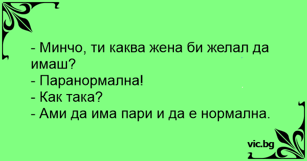 Каква жена би сакал да имаш? - Паранормална. - Зошто паранормална? - Да има пари и да е нормална!