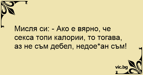 Мисля си: - Ако е вярно, че cekca топи калории, то тогава, аз не съм дебел, нeдoeбaн съм!