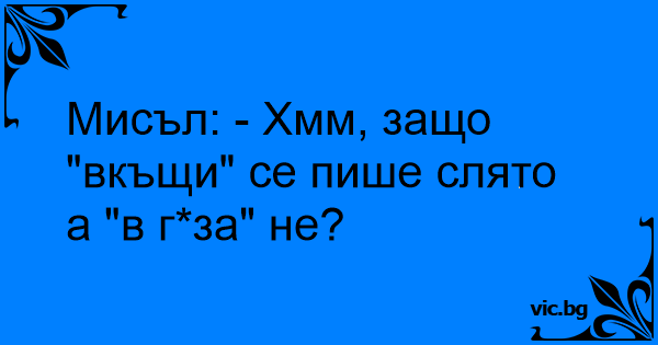 Мисъл: - Хмм, защо "вкъщи" се пише слято а "в гъзa" не?