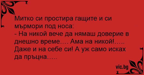 - На никой вече да нямаш доверие в днешно време…. Ама на никой!….. Даже и на себе си! А уж само исках да пръцна…..