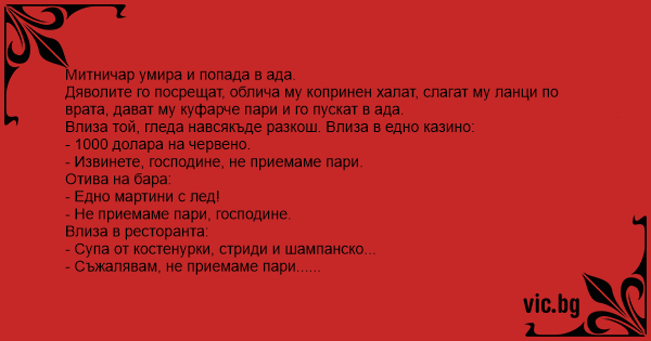 Дяволите го посрещат, облича му копринен халат, слагат му ланци по врата, дават му куфарче пари и го пускат в ада.