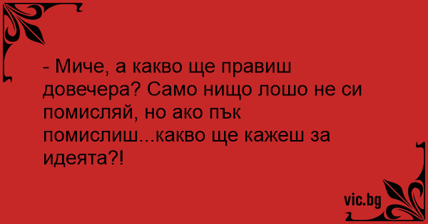 - Миче, а какво ще правиш довечера? Само нищо лошо не си помисляй, но ако пък помислиш...какво ще кажеш за идеята?!