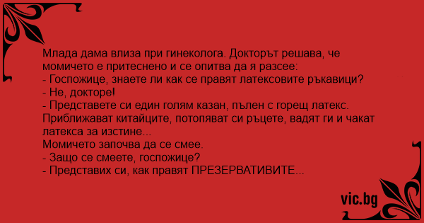 Младо момиче отива на гинеколог. Страшно е притеснена. За да разведри обстановката, лекарят, слагайки си латексовите ръкавици, казва: