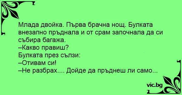 Млада двойка. Първа брачна нощ. Булката внезапно пръднала и от срам започнала да си събира багажа.