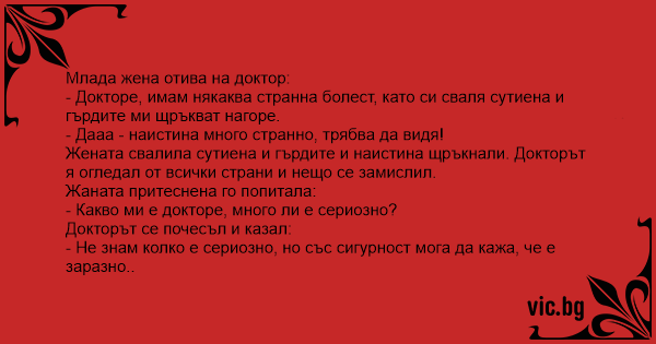 Жената свалила сутиена и гърдите и наистина щръкнали. Докторът я огледал от всички страни и нещо се замислил.