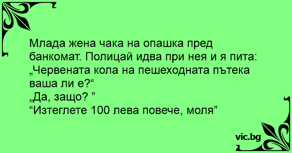Млада жена чака на опашка пред банкомат. Полицай идва при нея и я пита: