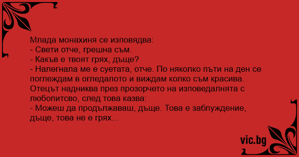 - Налегнала ме е суетата, отче. По няколко пъти на ден се поглеждам в огледалото и виждам колко съм красива.