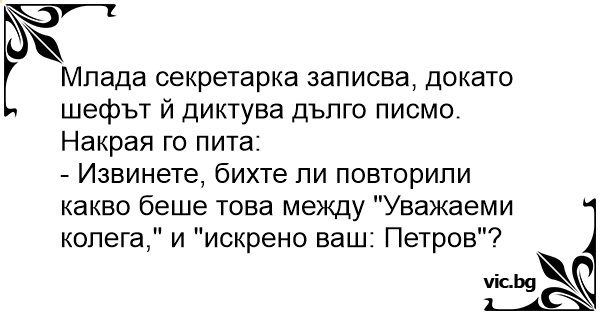 - Извинете, бихте ли повторили какво беше това между "Уважаеми колега," и "искрено ваш: Петров"?