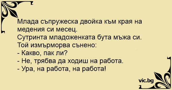 Сутринта младоженката бута мъжа си. Той измърморва сънено: