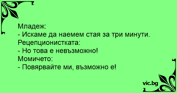 У готелі до портьє підходять хлопець і дівчина. Хлопець: — Я хотів би найняти номер на дві хвилини. Портьє: — Але це неможливо! Дівчина, похмуро: — Повірте мені, можливо.