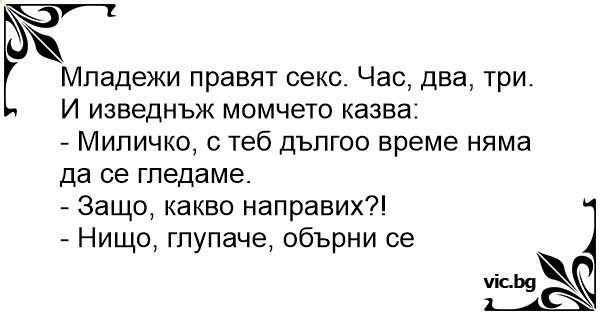 Младежи правят cekc. Час, два, три. И изведнъж момчето казва: