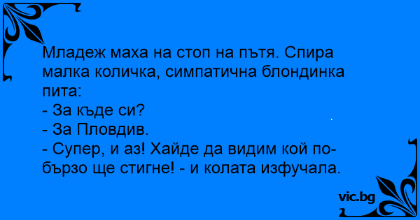 Младеж маха на стоп на пътя. Спира малка количка, симпатична блондинка пита:
