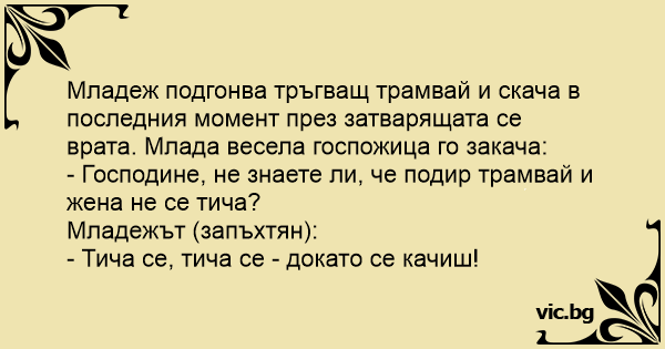 - Господине, не знаете ли, че подир трамвай и жена не се тича?