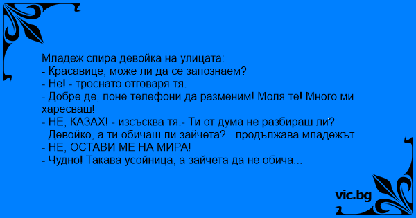 Младеж спира девойка на улицата: - Красавице, може ли да се запознаем? - Не! - троснато отговаря тя. - Добре де, поне телефони да разменим! Моля те! Много ми харесваш! - НЕ, КАЗАХ! - изсъсква тя.- Ти от дума не разбираш ли? - Девойко, а ти обичаш ли зайчета? - продължава младежът. - НЕ, ОСТАВИ МЕ НА МИРА! - Чудно! Такава усойница, а зайчета да не обича...