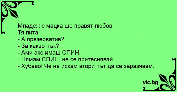 После непреспана ноќ, плавушата го прашува партнерот: - Извини заборавив вчера да те прашам, да не имаш СИДА случајно? Не, и одговара тој, а што ти текна баш на сега на тоа? - Онака, само што ја прележав , па да не фатам пак!