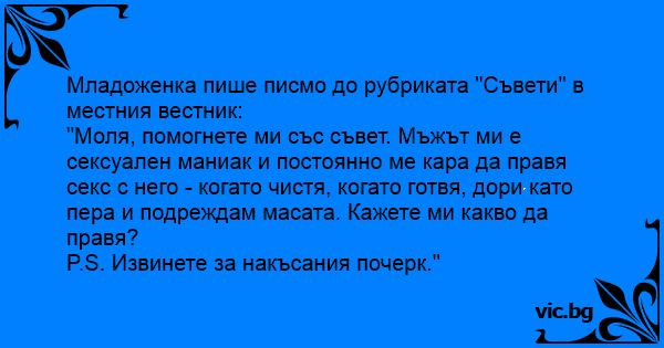 Младоженка пише писмо до рубриката "Съвети" в местния вестник: