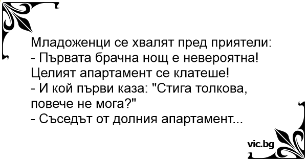 - Първата брачна нощ е невероятна! Целият апартамент се клатеше!