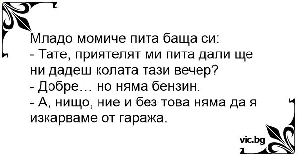 - Тате, можем ли с Киро да ползваме колата ти довечера? - Нямам бензин миличко. - О, това няма значение. Така или иначе няма да я изкараме от гаража