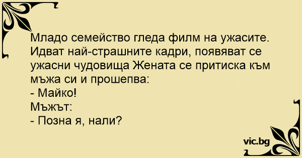 Чоловік з дружиною дивляться фільм жахів. На екрані з’являється ЖАХ. Дружина: — Ой мама... Чоловік: — Теща? Схожа...