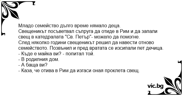 След няколко години свещеникът решил да навести отново семейството. Позвънил и пред вратата се изсипали пет дечица.